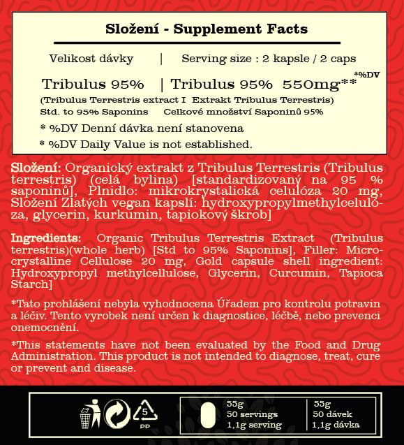Každá kapsle obsahuje 550 mg extraktu z organického Tribulus Terrestris, standardizovaného na 95 % saponinů.